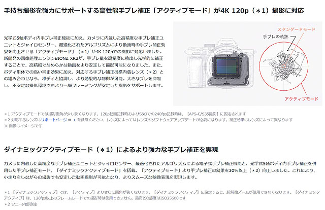 動画撮影時に手振れを抑えられる「アクティブモード」では4K 120P撮影に対応。またダイナミックアクティブモードもベーシックモデルのα7 Vに初搭載です。アクティブ手振れ補正よりも約30%の効果向上があるので、ジンバル風の撮影も可能になります。