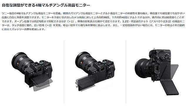 液晶モニターは待望の4軸マルチアングルが採用されました。バリアングルになれている方も、チルトが使いたかった方も両方満足です。