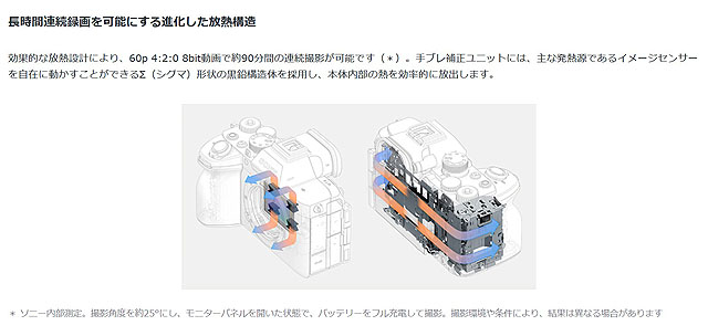 放熱構造も進化していてイメージセンサーを支えるシグマ形状の黒鉛構造体をα7 IVでは2基使っていたそうですが、α7 Vでは4基採用とのこと。本体内部の熱を効率的に放出可能。60Pの4:2:0 8bit撮影が室温25度で90分連続撮影ができるとなっています。