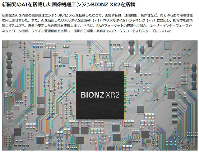 そして、このタイミングで画像処理エンジンが刷新されました。「BIONZ XR2」となっています。前回のBIONZ XR登場時は先代エンジンより8倍の高速化を果たしたというのが自慢でしたが、今回はプレスリリースを読む分にはそうした記述がないものの、処理速度の向上とともに省電力設計になっているということがアピールされています。