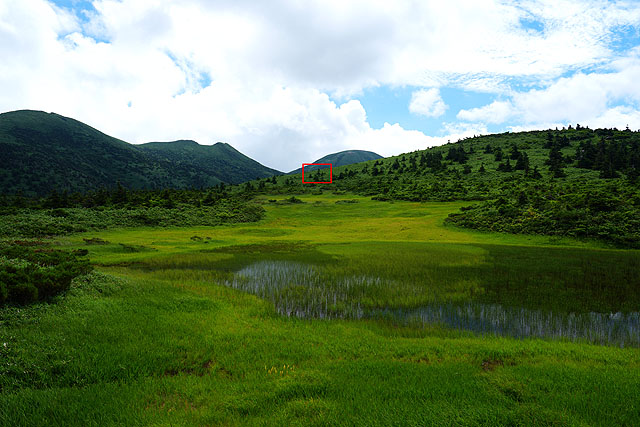 夏に撮影してきた湿原の写真なんですが、真ん中の赤枠のところを拡大してみます。