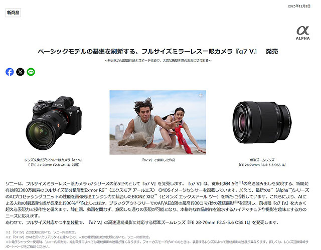 ★ソニープレスリリース「ベーシックモデルの基準を刷新する、フルサイズミラーレス一眼カメラ『α7 V』 発売 ~新世代のAI認識性能とスピード性能で、大切な瞬間を意のままに切り取る~」