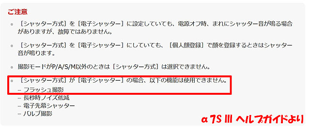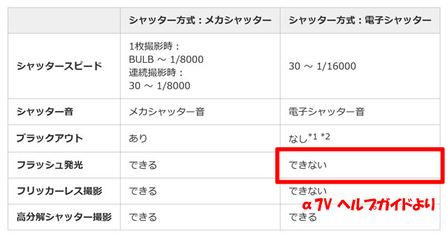 α7 Vのヘルプガイドが公開されていました。ヘルプガイドによると電子シャッター時のフラッシュ発光はできないそうです。