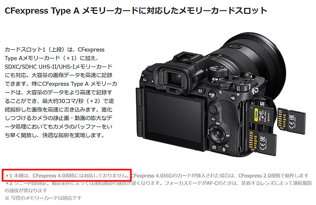 そして、これは最後になりますが「新型のα7 Vのメモリースロットは新規格の『CFexpress 4.0』に対応していますか?」とのことでしたが、こちらはサイトに記載があり、対応はしていないそうです。メモリーカードは「CFexpress 4.0」に対応した新モデルに置き換わりましたが、カメラ本体の対応はまだのようです。
