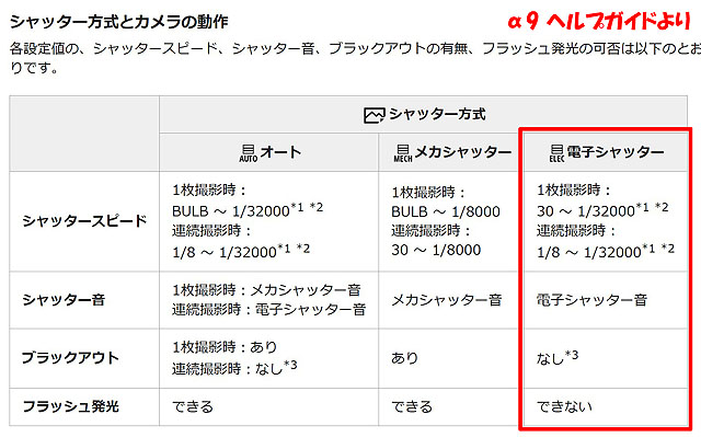 ゲームチェンジャー「α9」でも電子シャッター設定時はフラッシュ発光ができない、となっています。