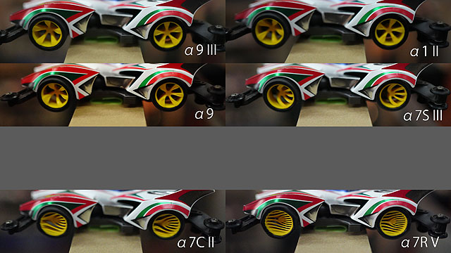 実際に当店店頭で撮影ができるモデルで、ミニ四駆にて撮影した比較画像がこちらになります。グローバルシャッター採用のα9 IIIは理論的にローリングシャッター歪みは発生しないのと、α1 IIもほぼひがみが見られないほどの画像になっています。初代α9についても、メカシャッターと遜色ないレベルと言われていましたが、確かにグローバルシャッター機に近い描写になっています。