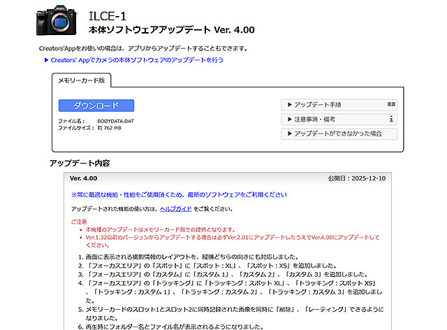 本機種のアップデートはメモリーカード版での提供となります。 Ver.1.32以前のバージョンからアップデートする場合は必ずVer.2.01にアップデートしたうえでVer.4.00にアップデートしてください。