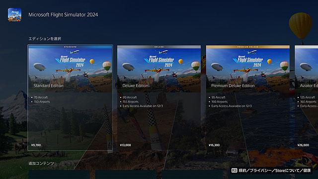 収録されている航空機や空港の数によってエディションが分かれており、航空機の追加データは後から個別に購入することもできます。最初から全部入っているのが26,000円バージョンで、あとは収録されている数でグレードが用意されているということになります。