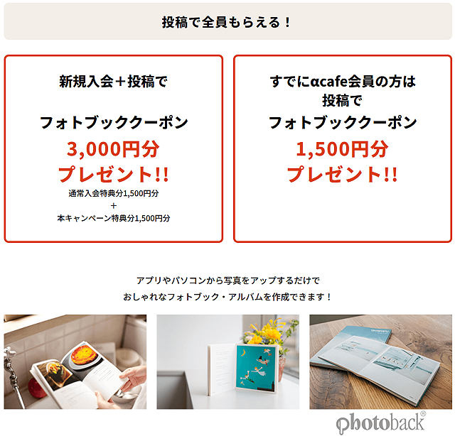 さらにαcafe新規入会された方には追加で1,500円分のフォトブッククーポンもプレゼント!合計で3,000円分のフォトブッククーポンがもらえる計算です。
