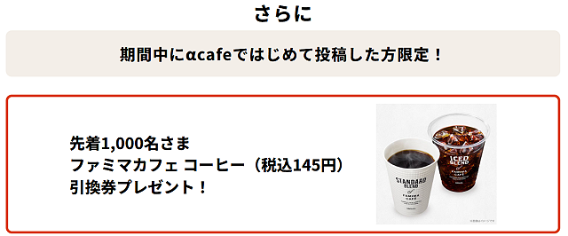 さらに期間中にαcafeではじめて投稿した方限定で先着1,000名にファミマカフェ コーヒー(税込145円)の引換券がプレゼントされる特典もあります。
