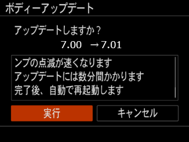 アップデート中のご注意が表示されますので、コントロールホイールの下キーを操作して最後までお読みください。読み終わったら「実行」を選択してアップデートを行います。