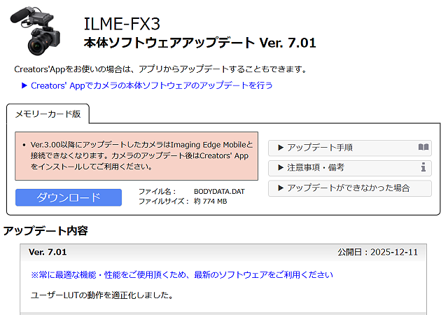 Cinema Lineカメラ『FX3』『FX3A』の本体ソフトウェアアップデートが公開になり、ユーザーLUTの動作が適正化されます。