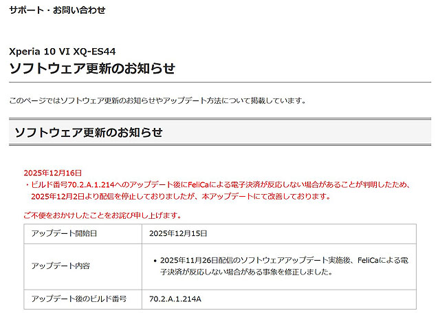 2024年モデルのミドルレンジスマートフォン「Xperia 10 VI」で起こっていたFelica決済に反応しない場合がある事象について、改善されたアップデートの配信がありました。12月16日から配信されています。