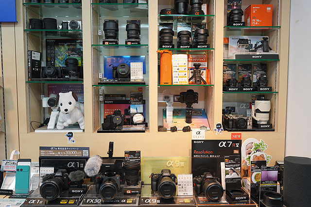 こちらは当店の”α”ボディ&”α”レンズ展示コーナーです。ここもスポットライトと蛍光灯の複合光源なのですが、 「α7 V」のオートホワイトバランスのおかげで見た目通りの色で撮れています。