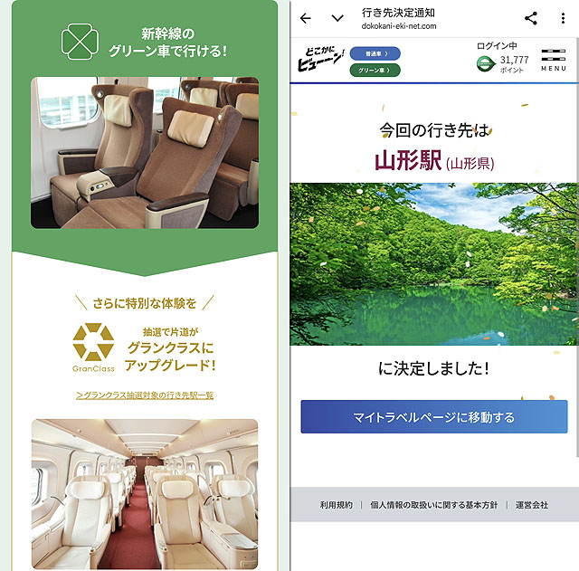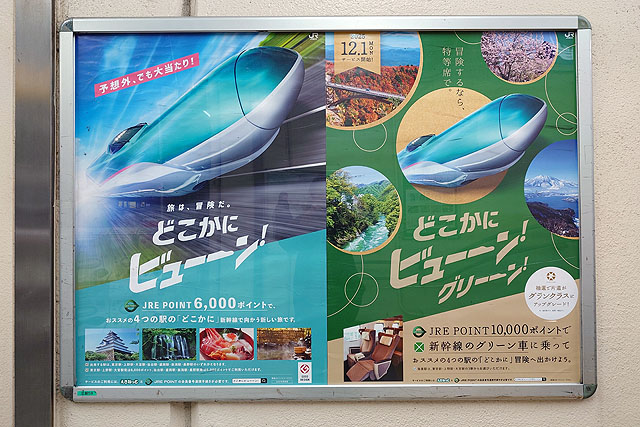 当店ではおなじみの「どこかにビューーン!」なんですが今月から新しいサービスが始まりました。「どこかにビューーン! グリーーン!」ということで、JREポイントを通常は6000ポイントのところ、10000ポイントにすることで行き帰りをグリーン席にしてくれるという、豪華バージョンが始まっています。