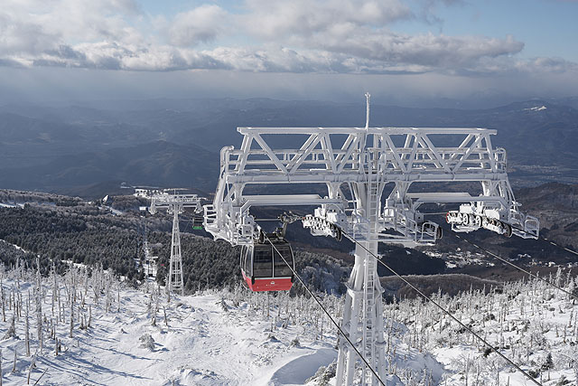 4,400円で往復チケットを買ってのりましたが、そうか、スキーで降りる人は片道チケットだけでいいのか。乗り継ぎをして20分ほどで山頂に到着します。