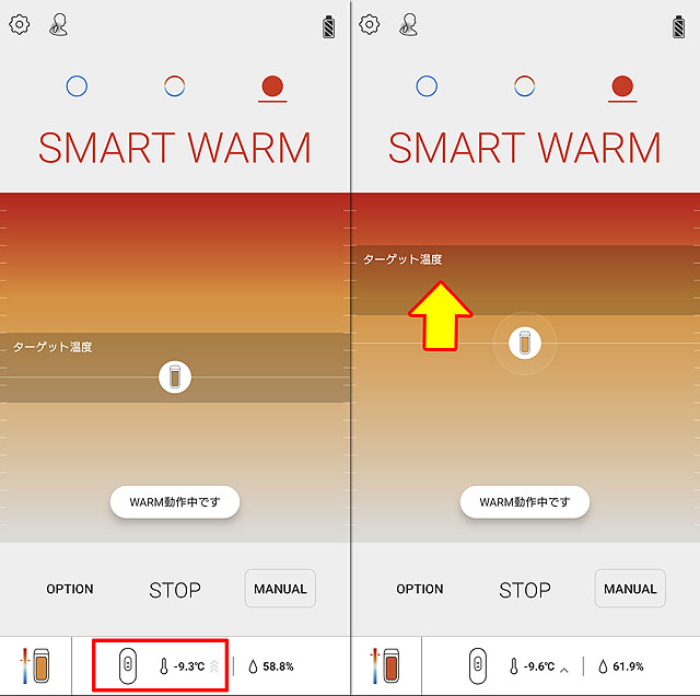 いつもは暖房設定は「弱暖」にしているREON POCKETですが、ここはレベルを上げて暖房性能を上げます。