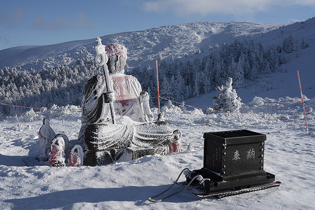 山頂のお地蔵様です。賽銭箱にはソリがついていて、移動可能になっているんですね。