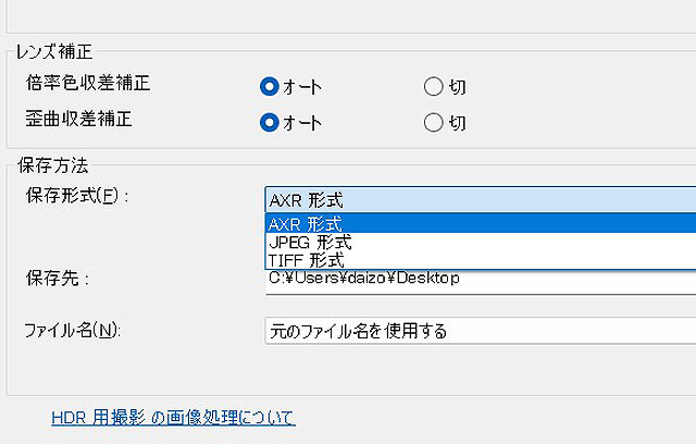 あとから、Imaging Edge Viewerで合成作業をするのですが、このときの出力はJPEGとTIFF、そしてAXR形式が選べます。