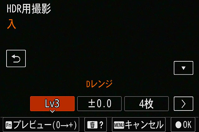 こちらがHDR用撮影の設定画面です。「Lv3」というところがありますが、これは輝度差がどれくらいあるのかを設定するところで「AUTO」という項目があるので、そのまま使うので良いと思います。