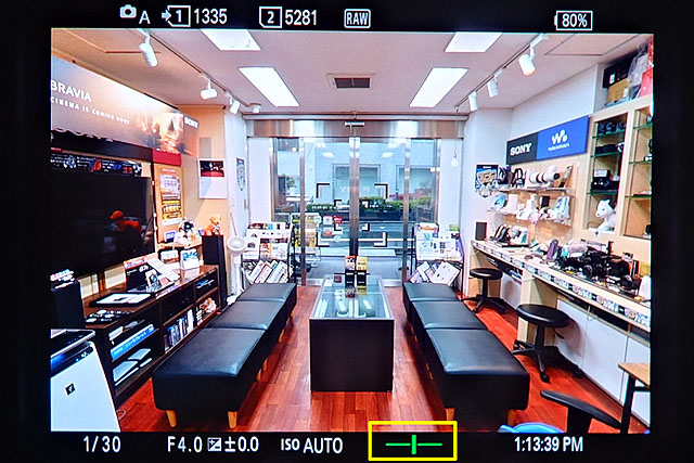 中央の縦線がずれると色がオレンジになって平行が取れていないことを示します。これだと撮影画像を目隠しせずに水準器が使えるし、良いかも。これは今のところ、α7 Vだけの機能ということになるかと思います。