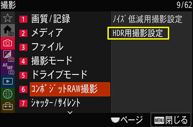そして、こちらが「α7 V」の新機能でコンポジットRAW撮影の「HDR用撮影設定」が使えます。これは複数枚のRAW撮影を行い、あとからソニーのRAW現像ソフト「Imaging Edge Viewer」を使って合成して、輝度差の広いシーンを綺麗にまとめるHDR合成をすることができます。