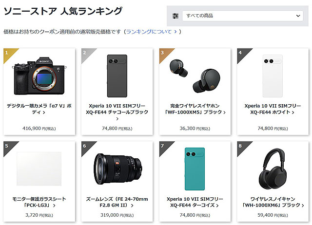 ソニーストアさん、全体ではミッドレンジモデルの「Xperia 10 VII」がこんなにも人気だったんですね!? 当店では「Xperia 1 VII」の方が数倍の人気になっていて、そこだけ違いを感じるものの「α7 V」が圧倒的な人気になっていたり、レンズでは「SEL2470GM2」が今月は大ブレイクしていたりするのは一緒です。