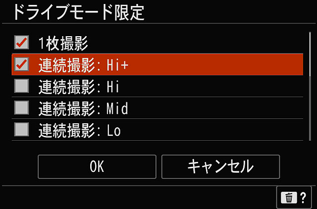 ドライブモードは1枚撮影と連続撮影を行ったり来たりしたいので、まずは「ドライブモード限定」という項目で、この二つのモードを残してあとは全部オフにします。