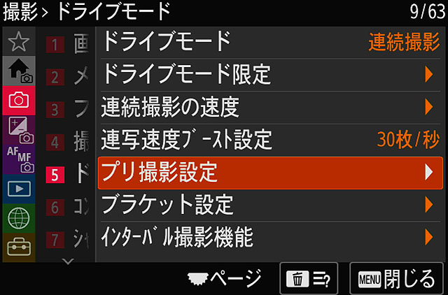 続いてプリ撮影設定を操作するんですが、プリ撮影を使うためには電子シャッターに設定しておく必要があるので注意。ドライブモードを連続撮影にしてからプリ撮影設定を操作します。
