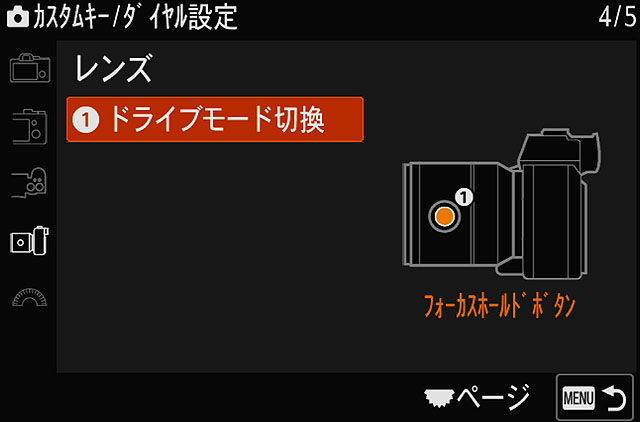 そして、先ほどの「ドライブモード切替」を任意のボタンに割り当てます。α1 IIやα9 IIIだと、C5ボタンがあるのでそこに割り当てるんですが、α7 VにはC5ボタンがないので、レンズについているフォーカスホールドボタンとかに割り当てると切り替えがしやすくなります。
