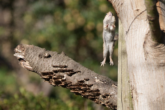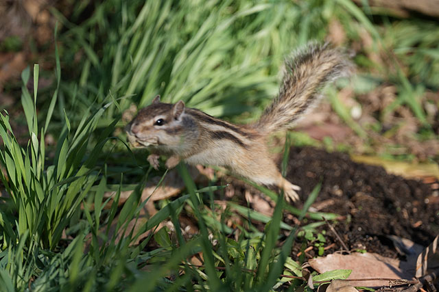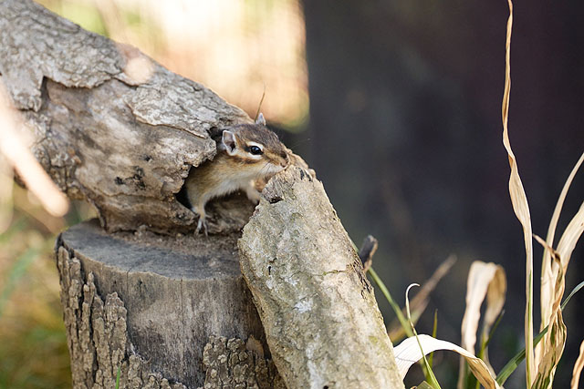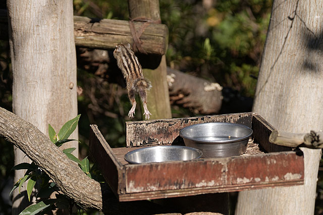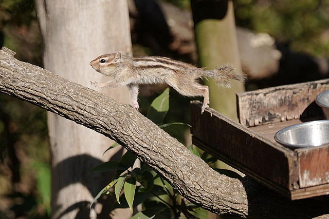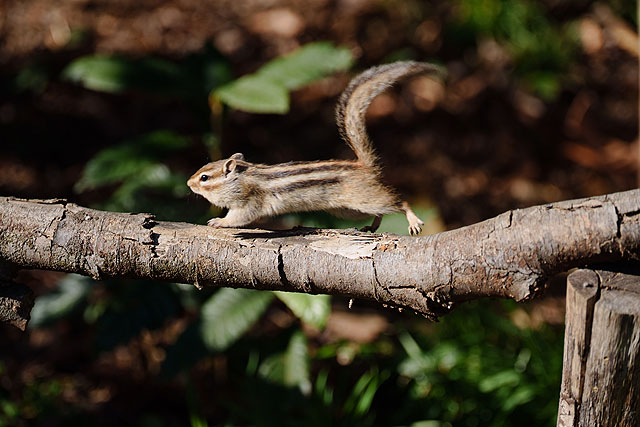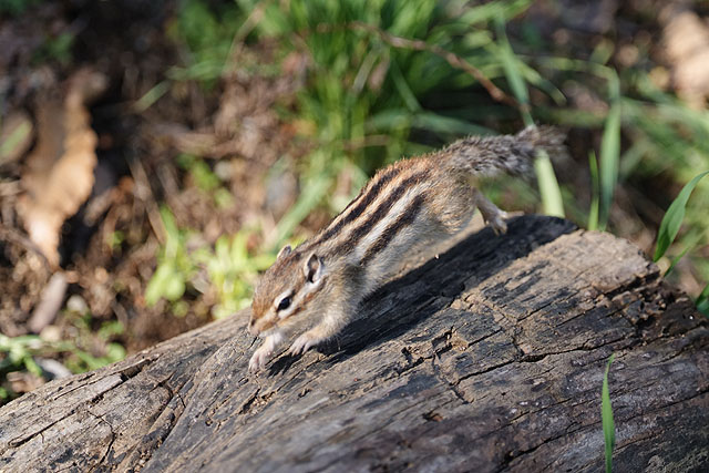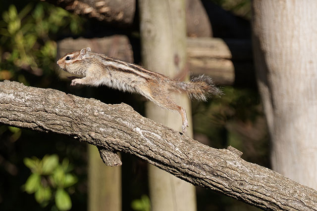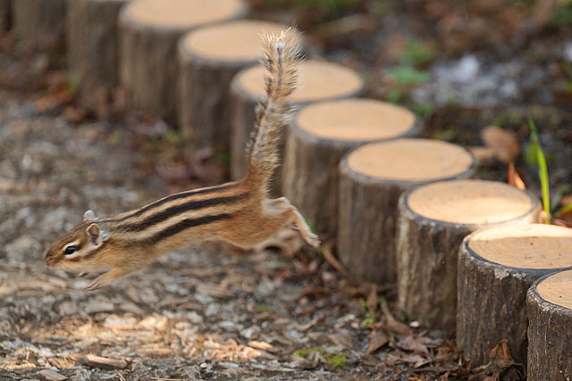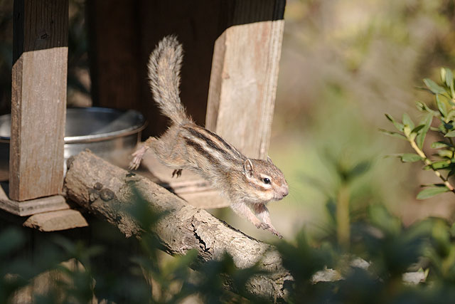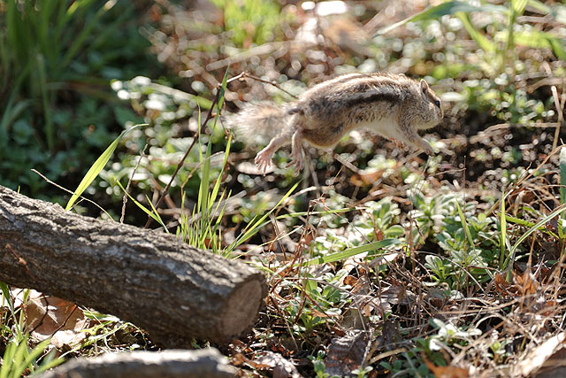 止まっているシマリスが、なにかの拍子にジャンプするんですが、そのジャンプする方向はたまに予想外の方向だったりします。このときは上にジャンプ。