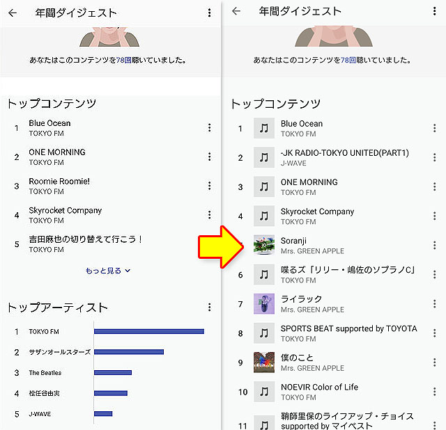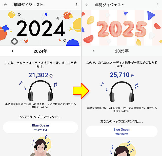 ヘッドホンの使用時間のログだけではなく、再生していたコンテンツなどもリストアップしてくれます。左が2024年のダイジェスト、右が2025年のダイジェストです。毎年12月に更新されるので、11月までに前年のリストをスクリーンショット撮影しておくと、こうして見比べることができます。