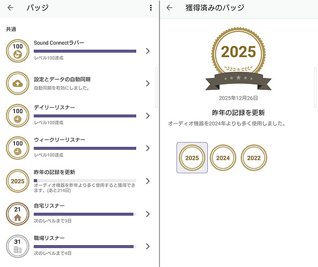 見事、2024年の記録を塗り替えて2025年のバッジがもらえました! こういうバッジ機能とかついていると、ヘッドホンを使うモチベーションがあがるんですよね。