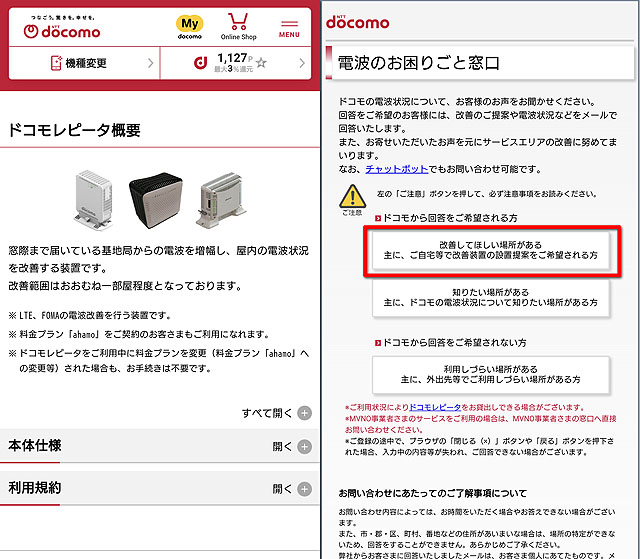 申し込み窓口がどこにあるのかわからなかったんですが、ドコモの「電波のお困りごと窓口」というところから申し込みができるとのこと。