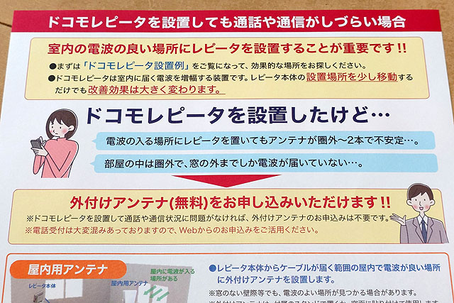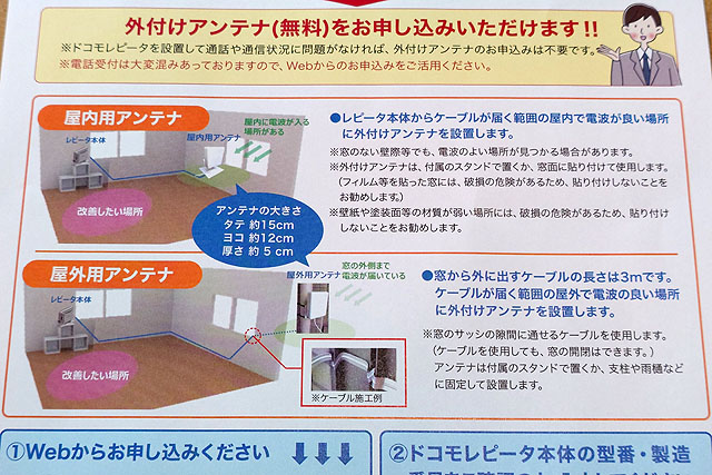 さて、折込の説明書によると、ドコモレピータを設置しても通信がしづらい場合は外付けアンテナの申し込みができるとのこと。