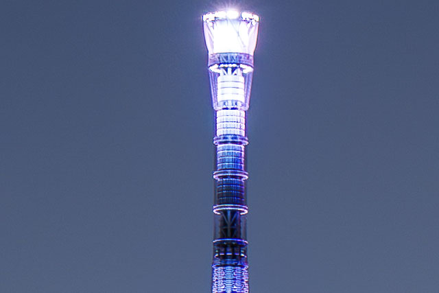 非常に明るいスカイツリー最上部のライトと、まだ明るさの残る空を同時に捉えた1枚です。