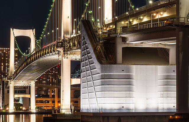 強い照明で照らされた橋脚部分が白く潰れず質感を保っています。コンクリートのトーンや立体感が残っていることで、写真全体に重厚感があります。