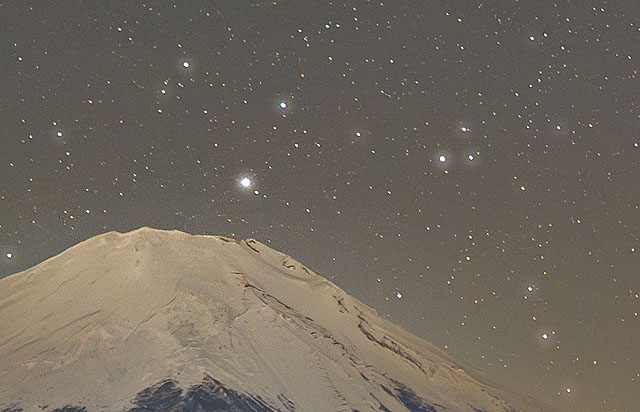 星の点像を保ったまま、空のザラつきが抑えられ、富士山の稜線も自然に浮かび上がっています。通常ならノイズが目立ちやすい条件でも、情報量を残したままクリアな仕上がりです。