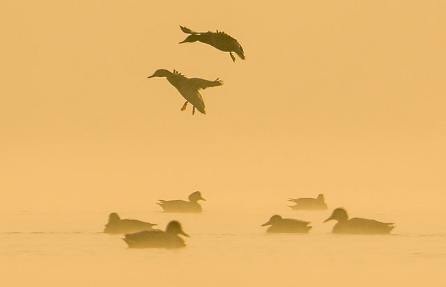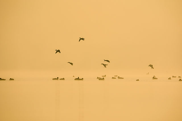 ■朝霧の湖面と水鳥