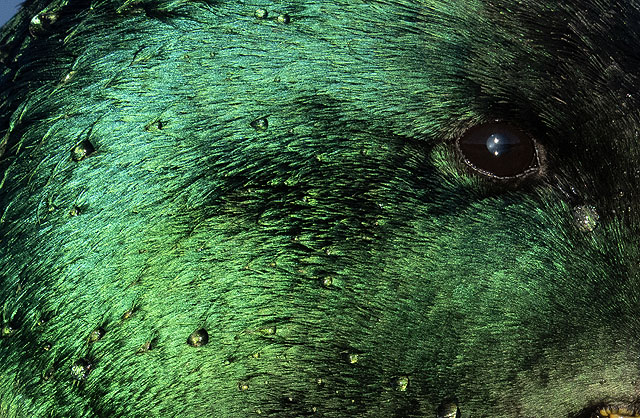 緑の頭部の微妙な色変化、水滴の質感までしっかり再現されています。