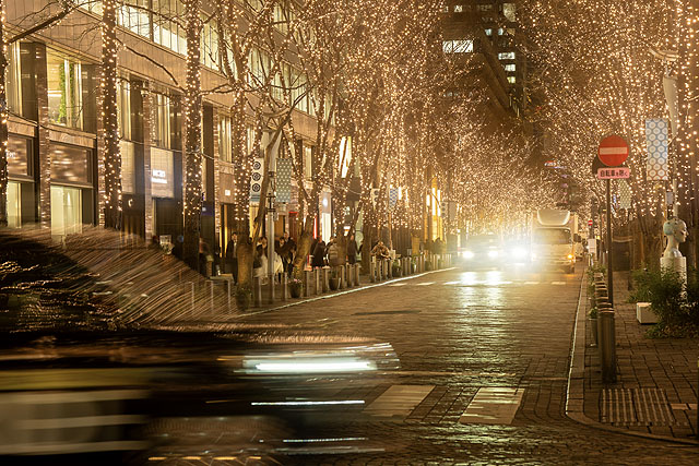 イルミネーションの点光源が画面いっぱいに並ぶ、ハイライト処理の難しいシーンです。ブラックミストフィルターによって光が滲みつつも、白く破綻せず、階調を保ったまま表現されています。