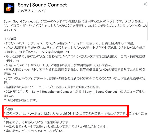 ソニーのヘッドホン用アプリ『Sony | Sound Connect(以下 Sound Connect)』の最新バージョンの更新時にAndroid 11以降のみのサポートになる旨のメッセージがありました。