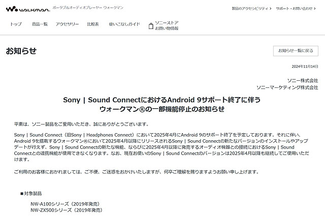 ★Sony | Sound ConnectにおけるAndroid 9サポート終了に伴うウォークマン®の一部機能停止のお知らせ