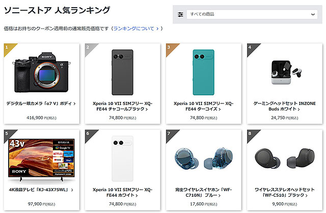 ソニーストアの人気ランキングは商品ジャンルごとにフィルターをかけることができます。ヘッドホンとゲーミングヘッドセットに絞ると今朝の時点では上記のランキングになります。
