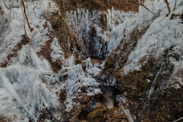 渓谷の奥行きと、流れ続ける水、凍結した岩肌をまとめた一枚です。ダイナミックレンジの広いα7 VのRAWだからこそ、暗部の谷間から明るい氷柱まで破綻なく表現できています。