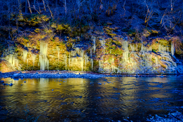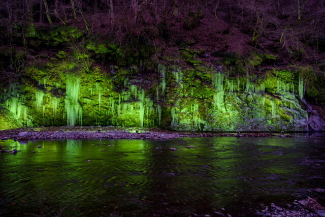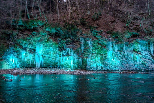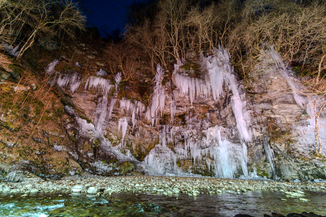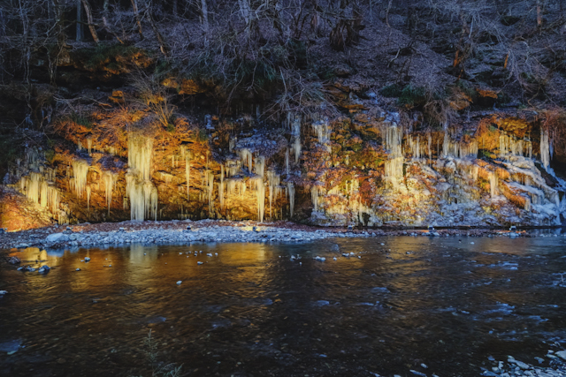 ライトアップが切り替わる合間の、比較的ニュートラルな色味を捉えたカットです。氷、岩肌、川面、それぞれの明るさの違いが自然につながり、α7 VのRAWの懐の深さを感じます。