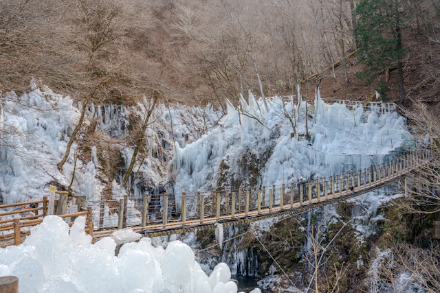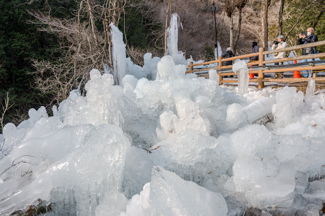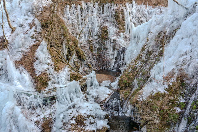 まずは尾ノ内渓谷の写真で氷柱が連なる渓谷全体を俯瞰で捉えた一枚です。RAWで撮影しているため、氷の白さを保ったまま、背景の岩肌や木々の階調もしっかり残っています。