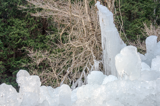 一本の氷柱を主役にし、周囲の枝や背景を整理した構図です。RAWデータの情報量があるおかげで、氷の内部の層や気泡のニュアンスまで描写できています。