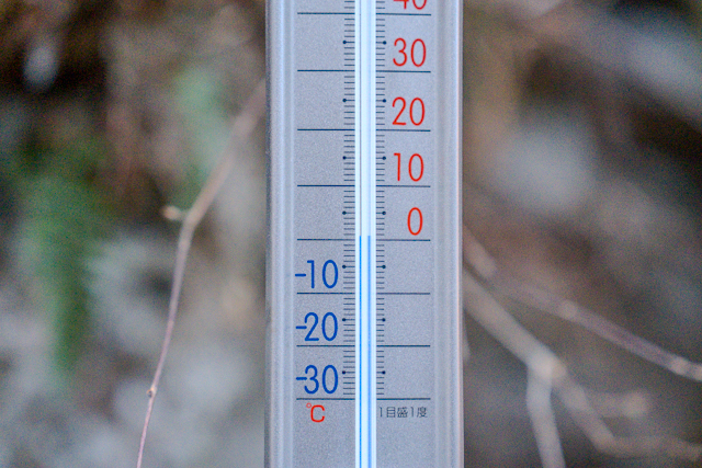 現地の寒さをそのまま伝えてくれる、温度計のカットです。数字や目盛りの白さを保ったまま、背景のボケも自然に階調が残っているのはRAWならでは。