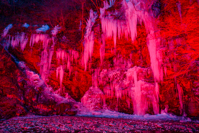 赤いライトに包まれた氷瀑を、画面いっぱいに捉えた一枚です。非常に彩度の高いシーンですが、RAWで撮影していることで氷の白さと質感がきちんと保たれています。